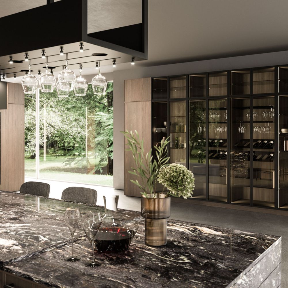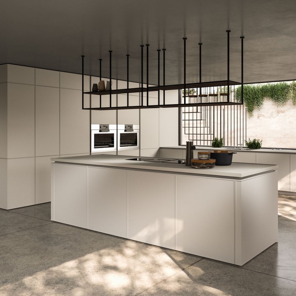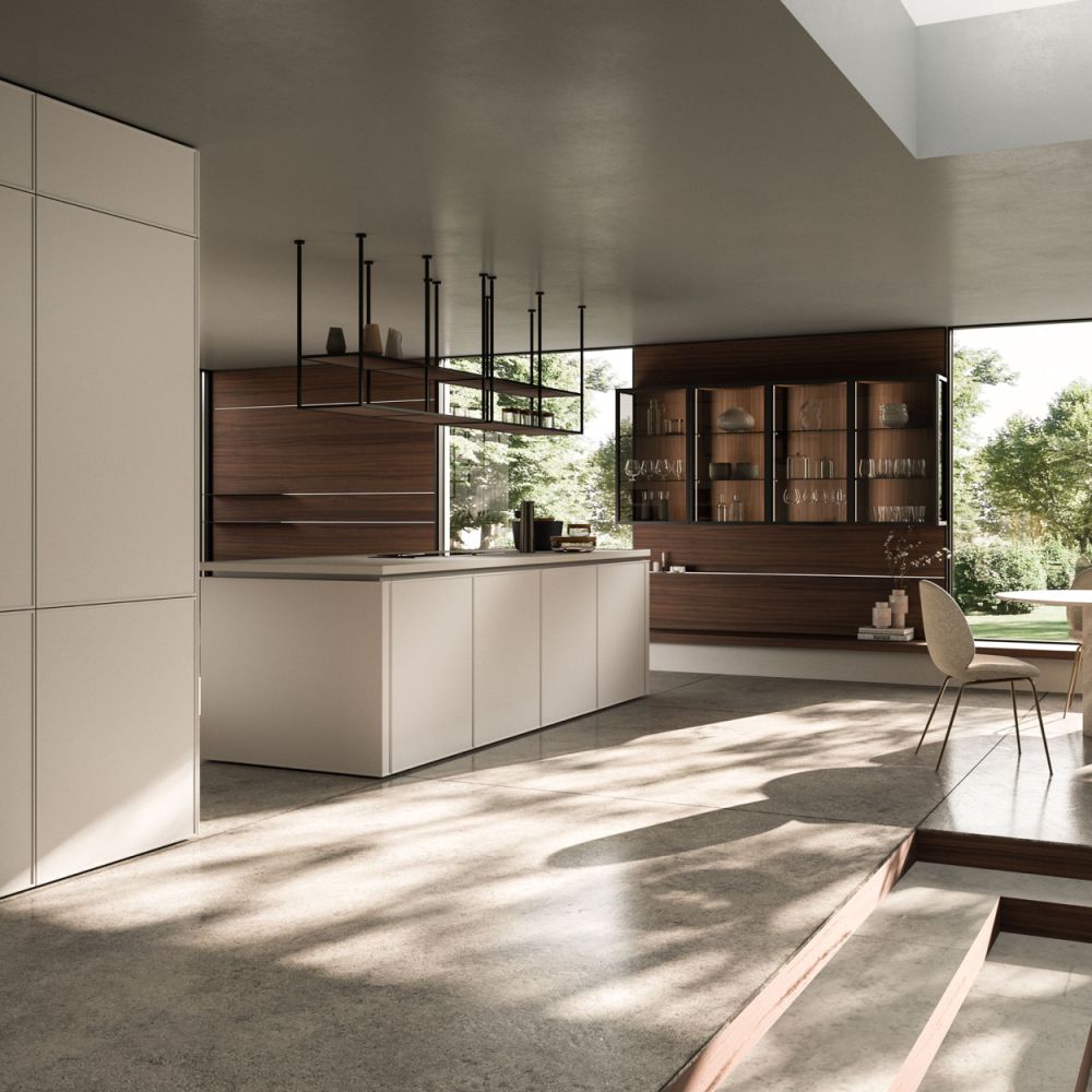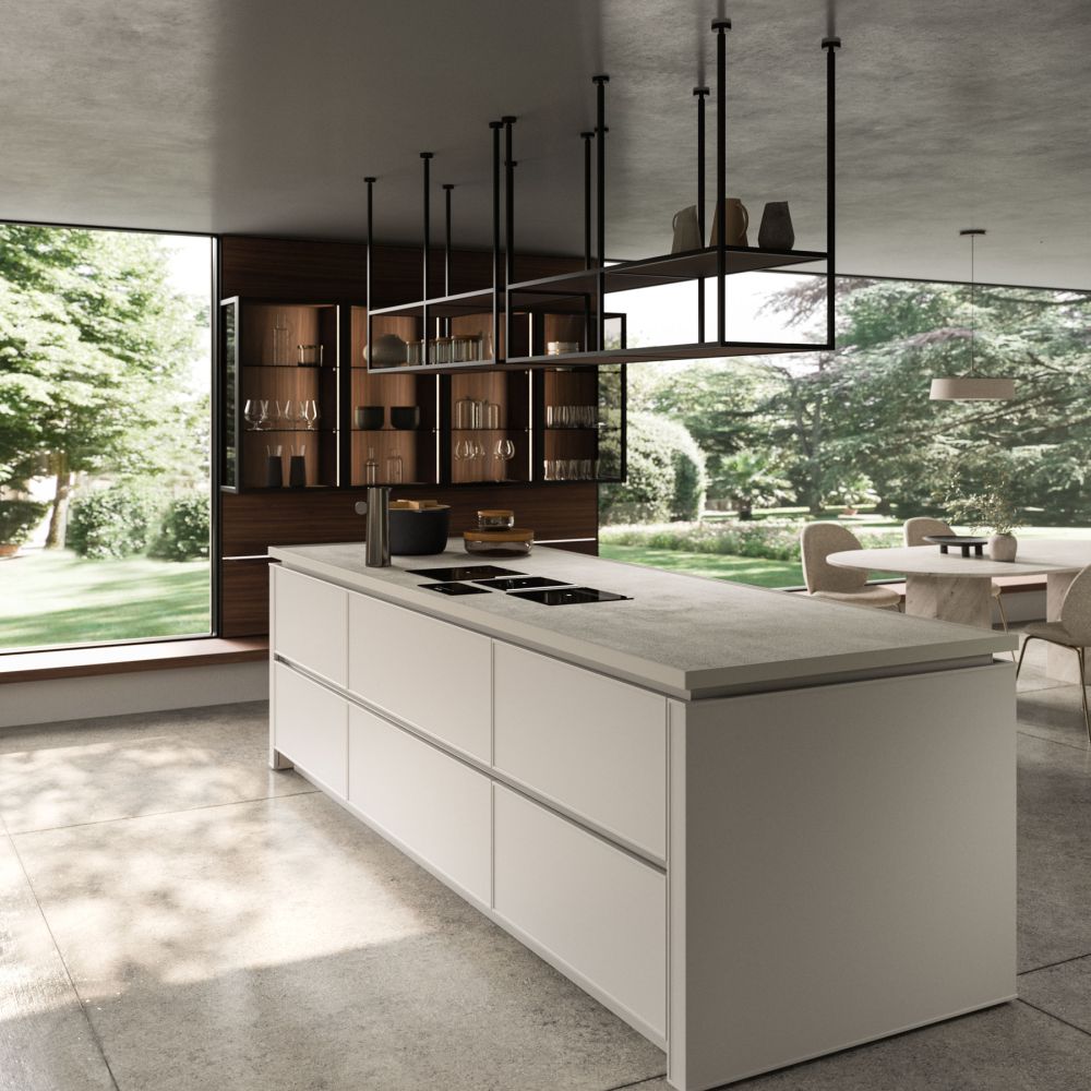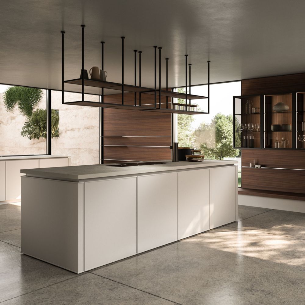 The Quadra Kitchen’s frame geometry is enhanced by broad adaptability and distinctive matching accessories.
