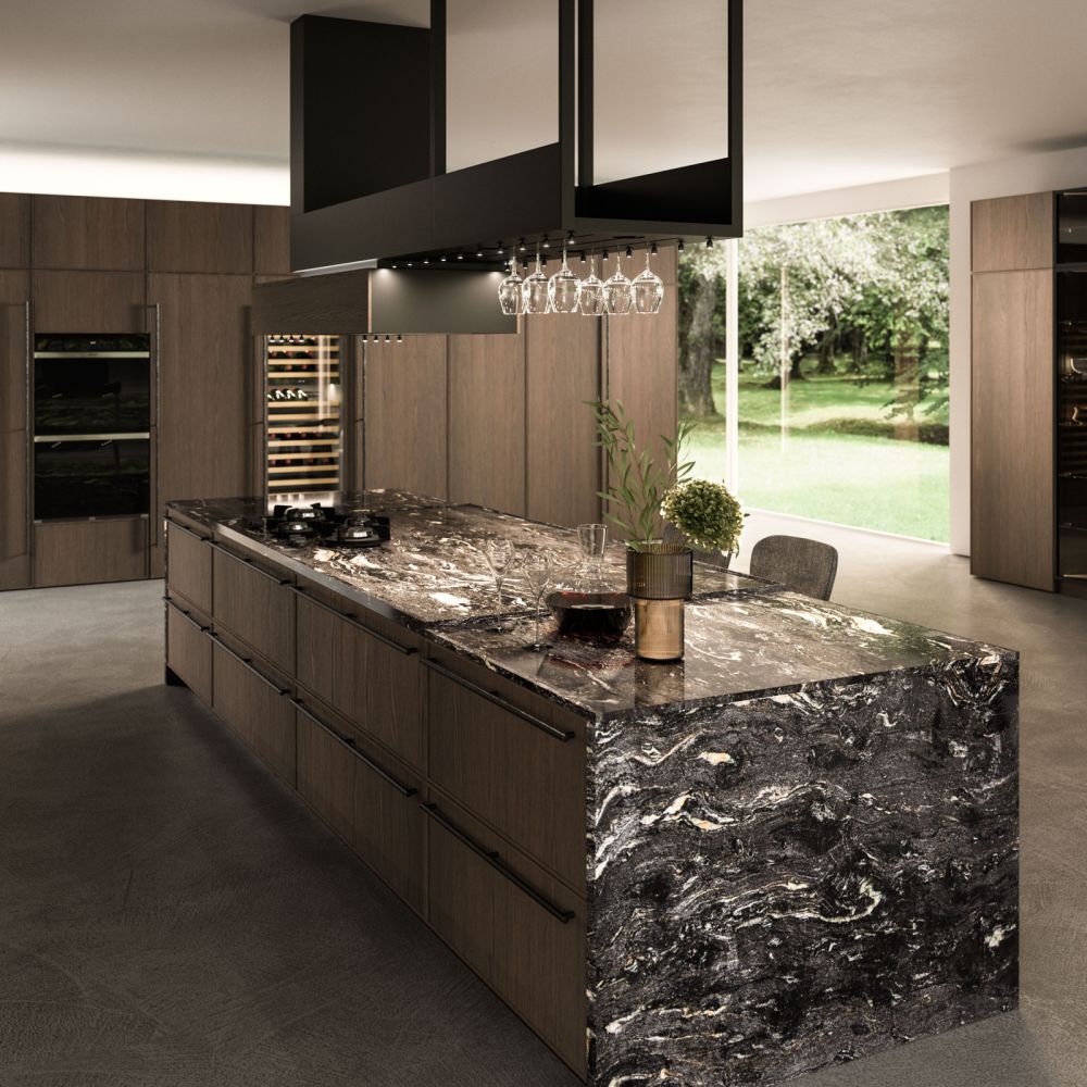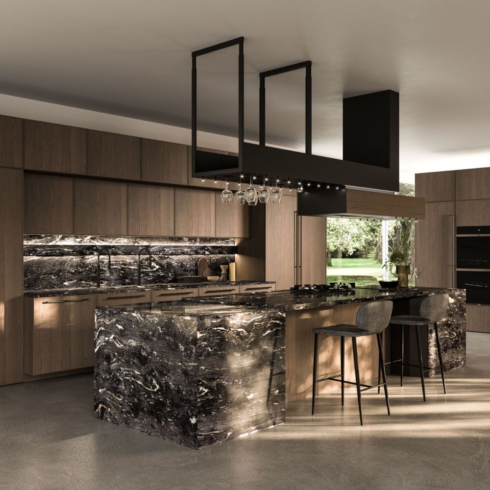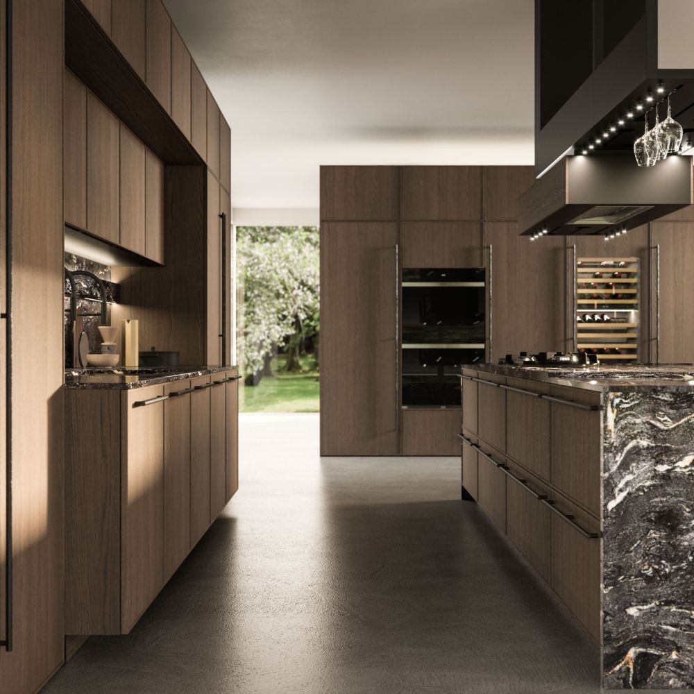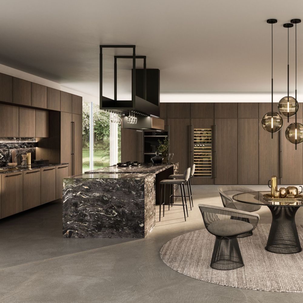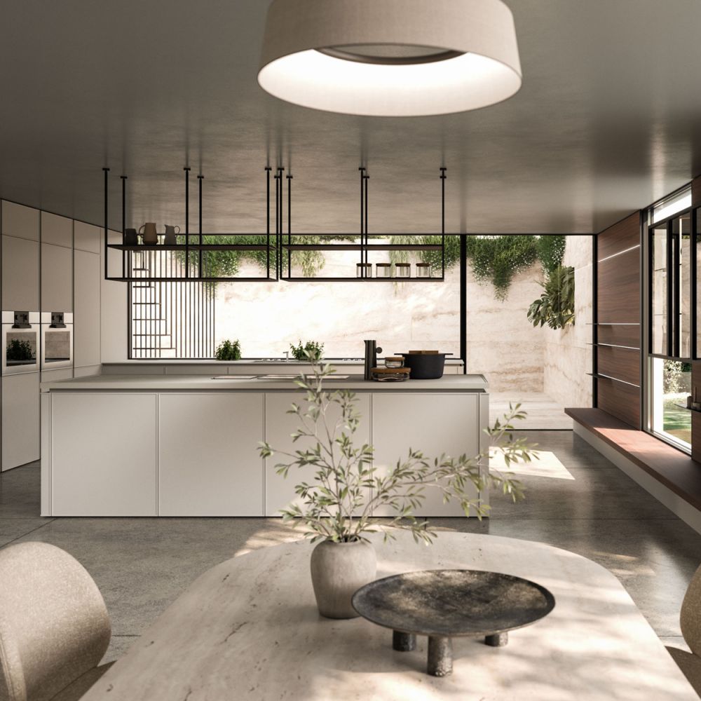 The Quadra Kitchen’s frame geometry is enhanced by broad adaptability and distinctive matching accessories.