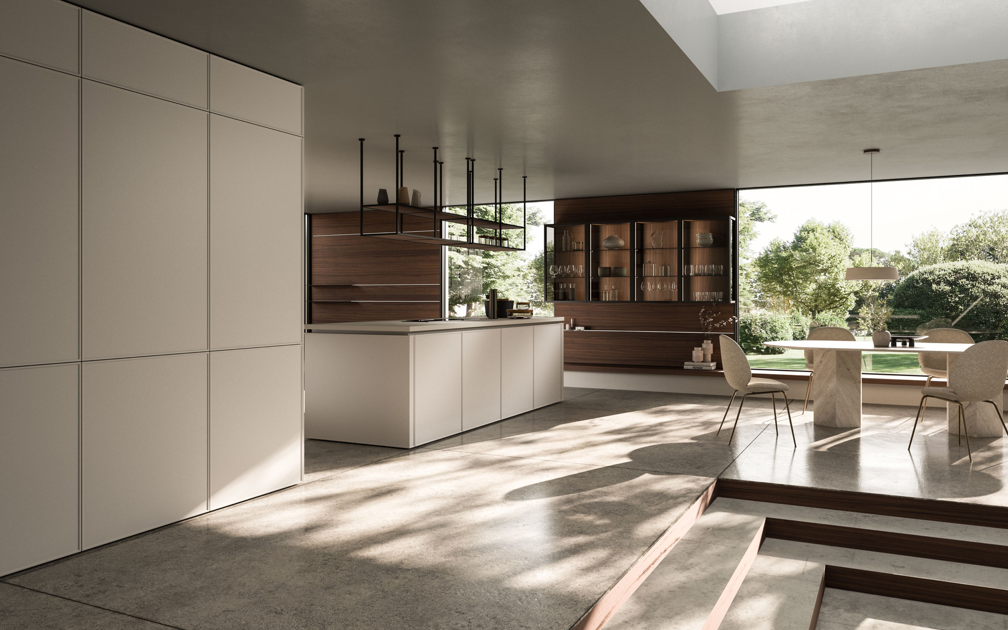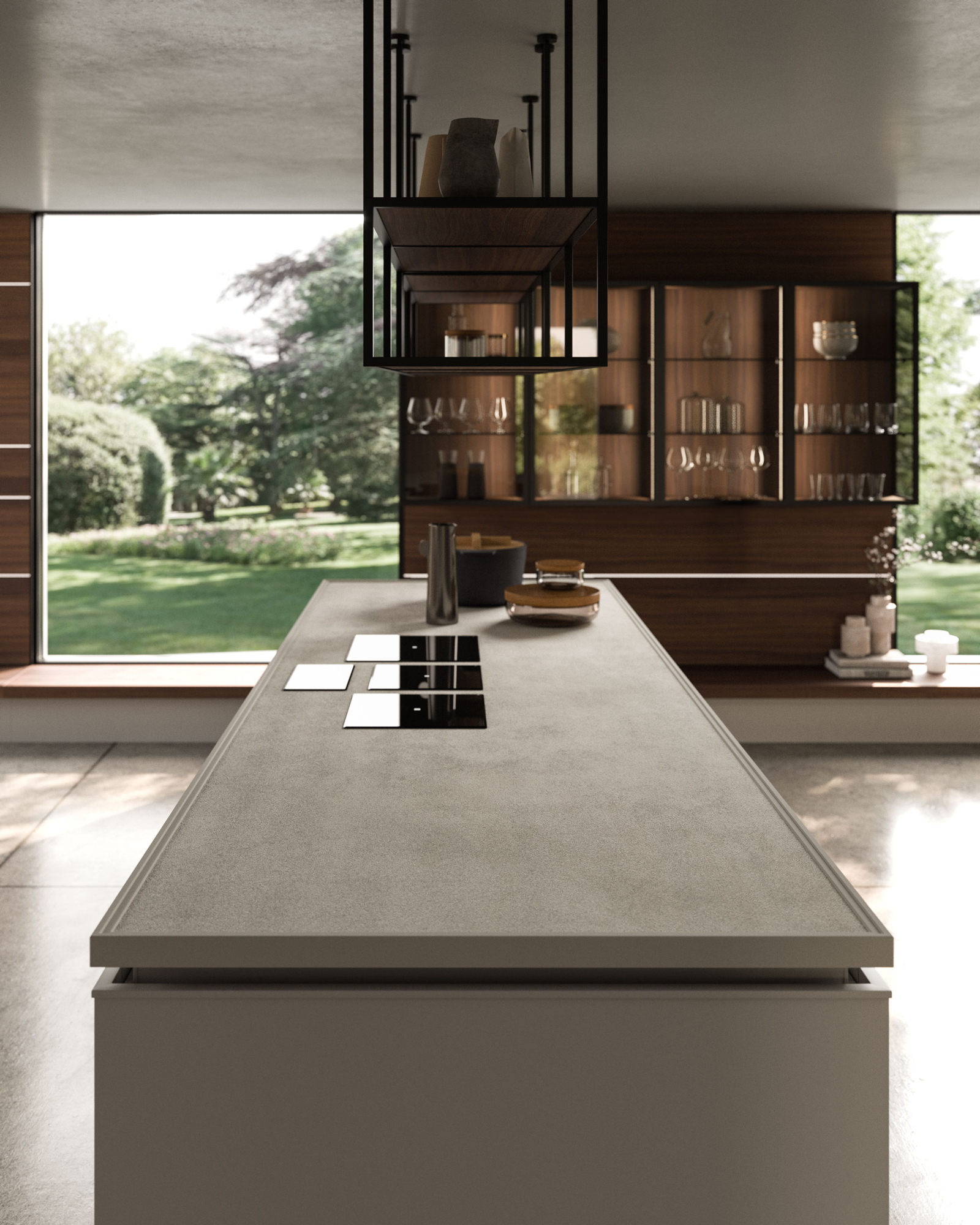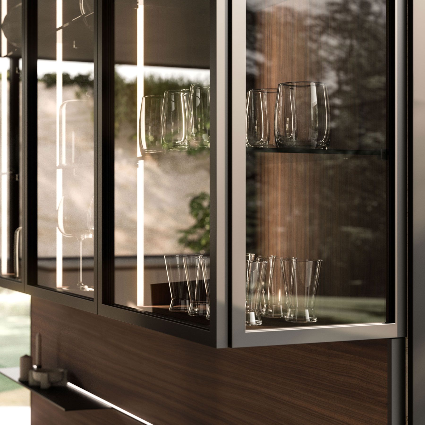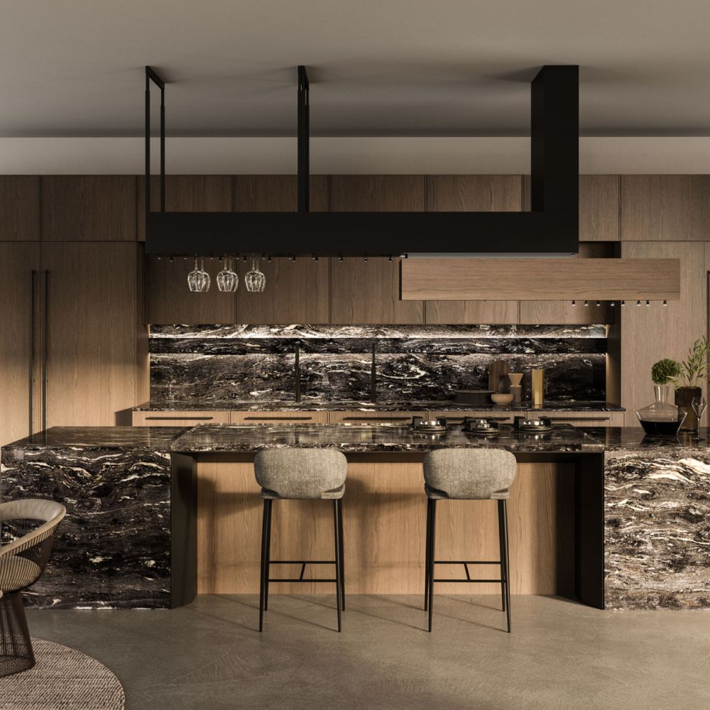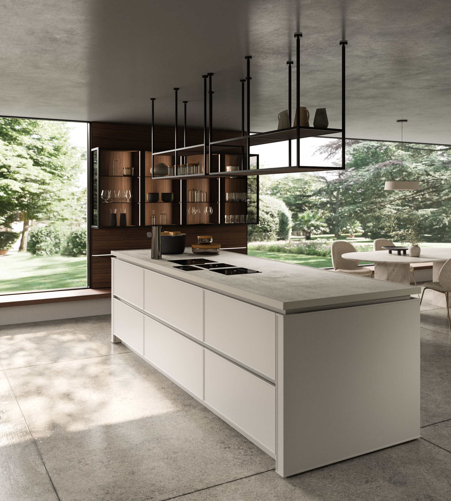 The Quadra Kitchen’s frame geometry is enhanced by broad adaptability and distinctive matching accessories.