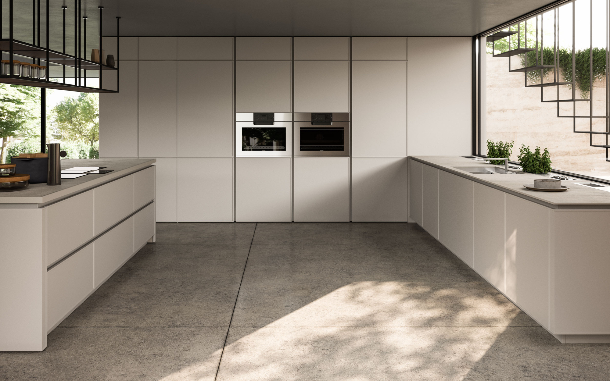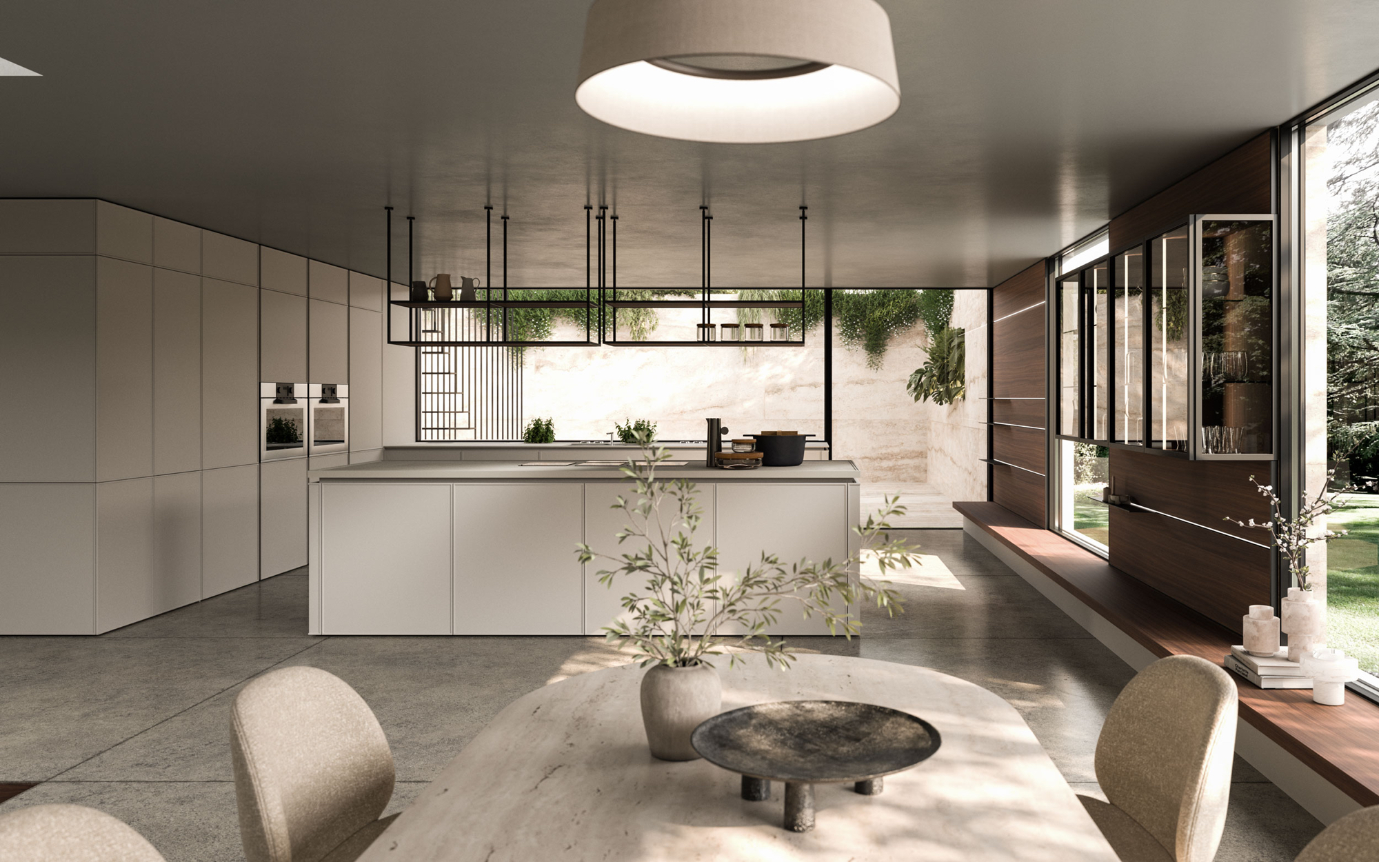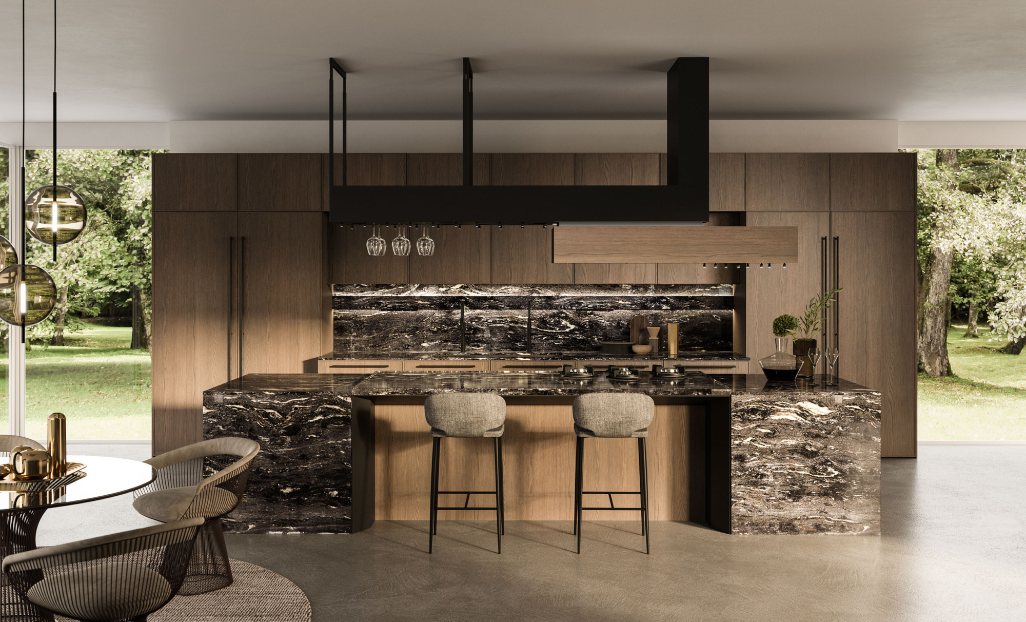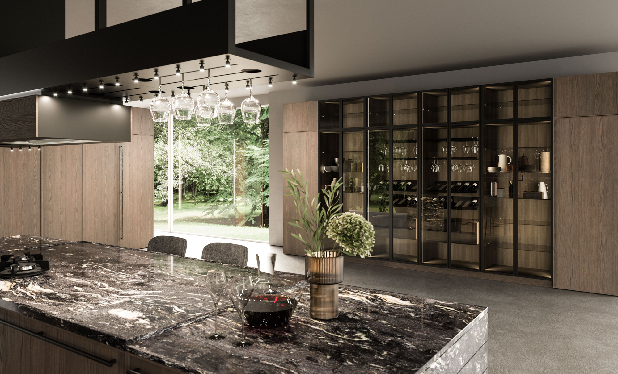 The Quadra Kitchen’s frame geometry is enhanced by broad adaptability and distinctive matching accessories.