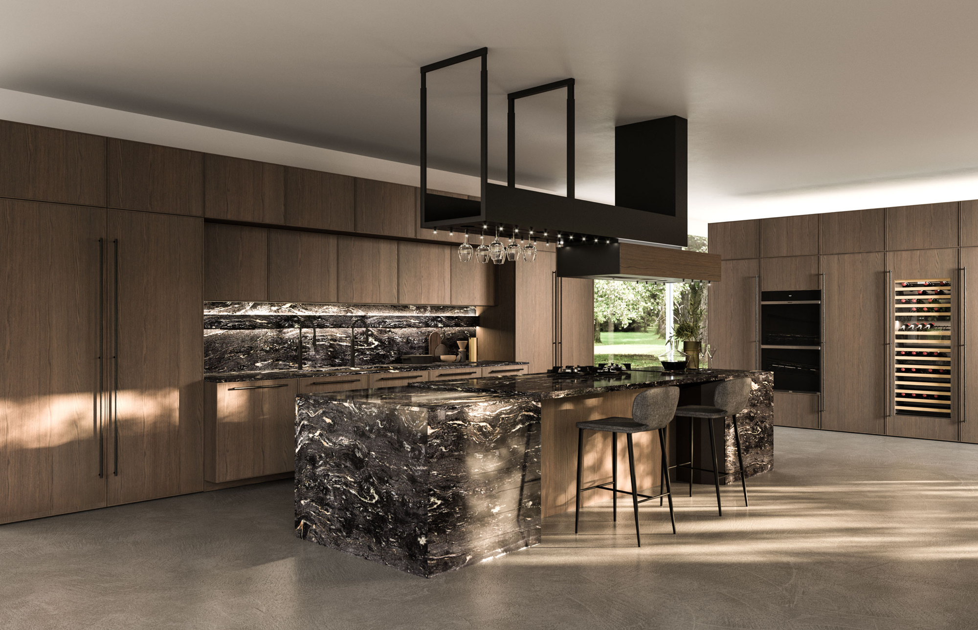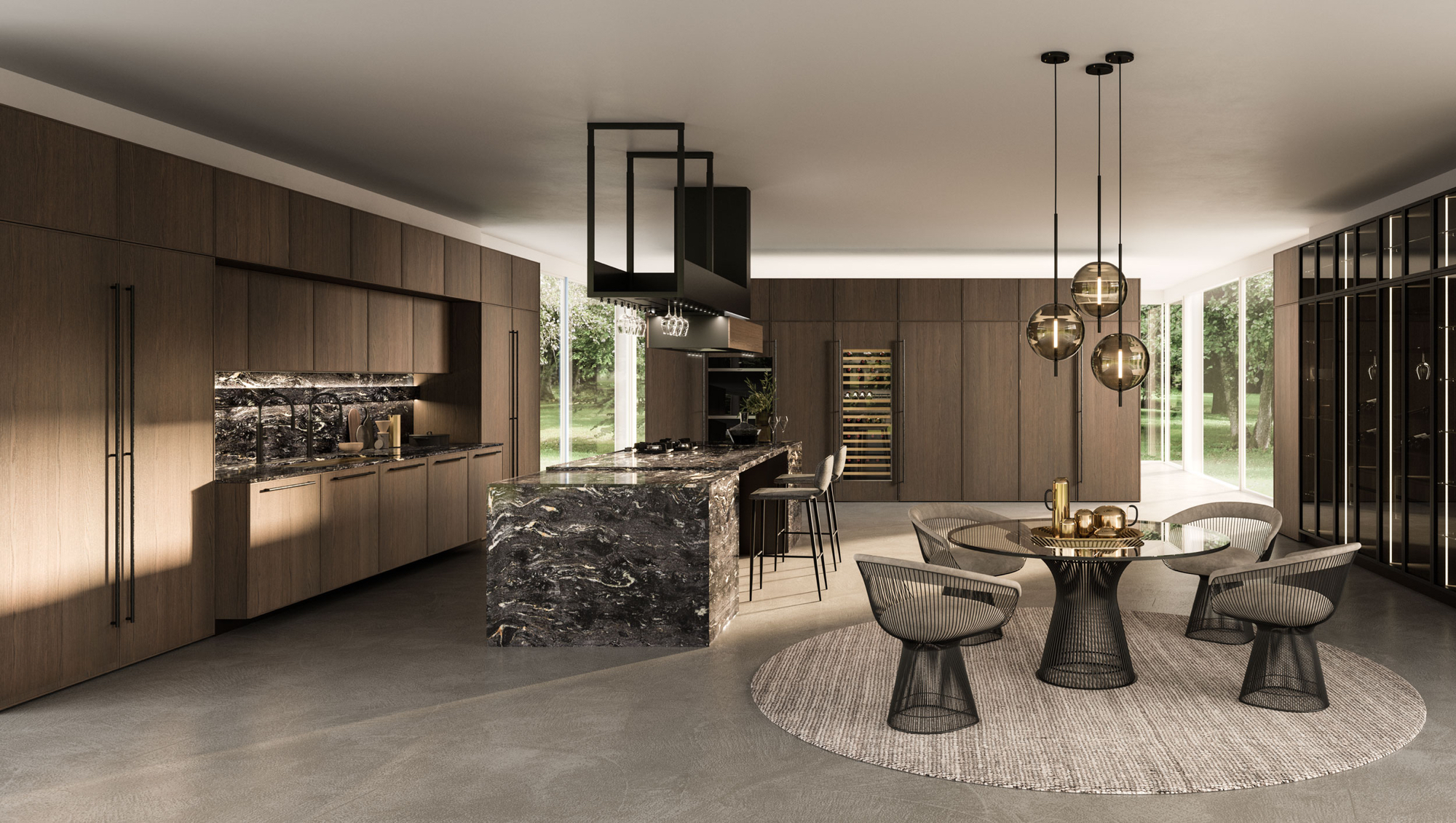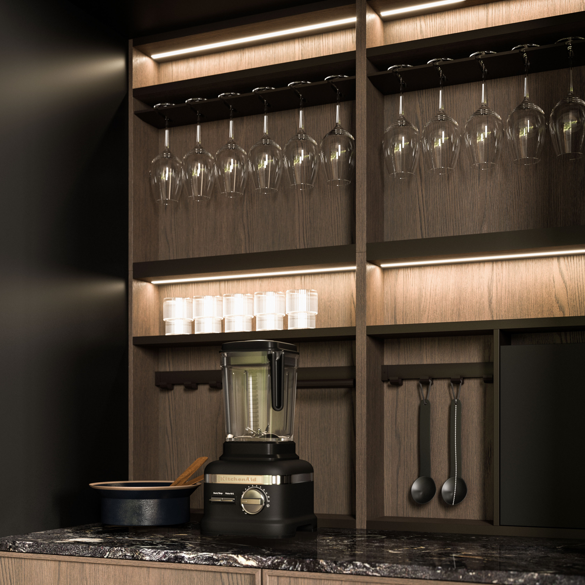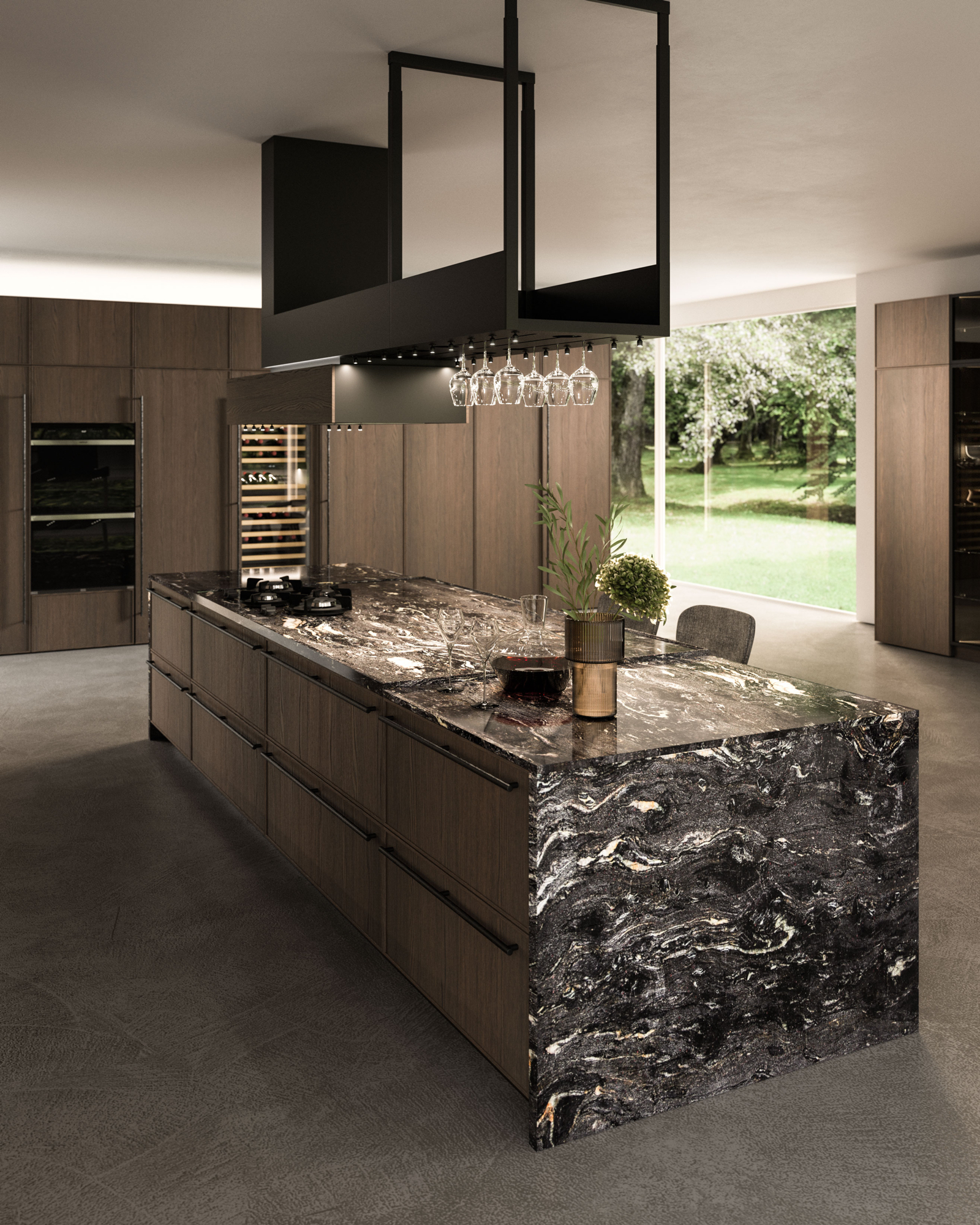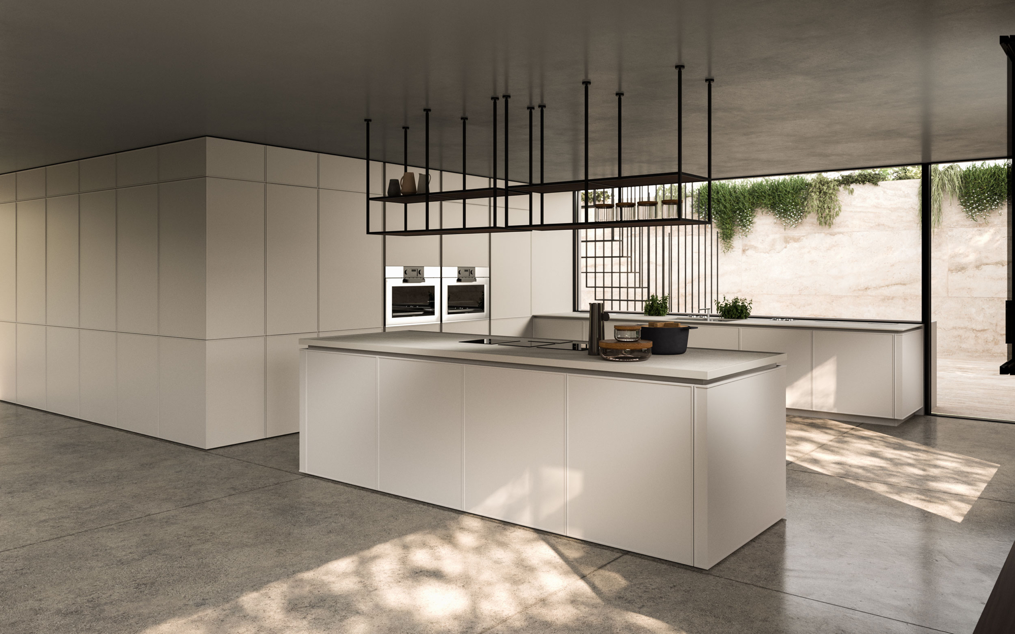 The Quadra Kitchen’s frame geometry is enhanced by broad adaptability and distinctive matching accessories.